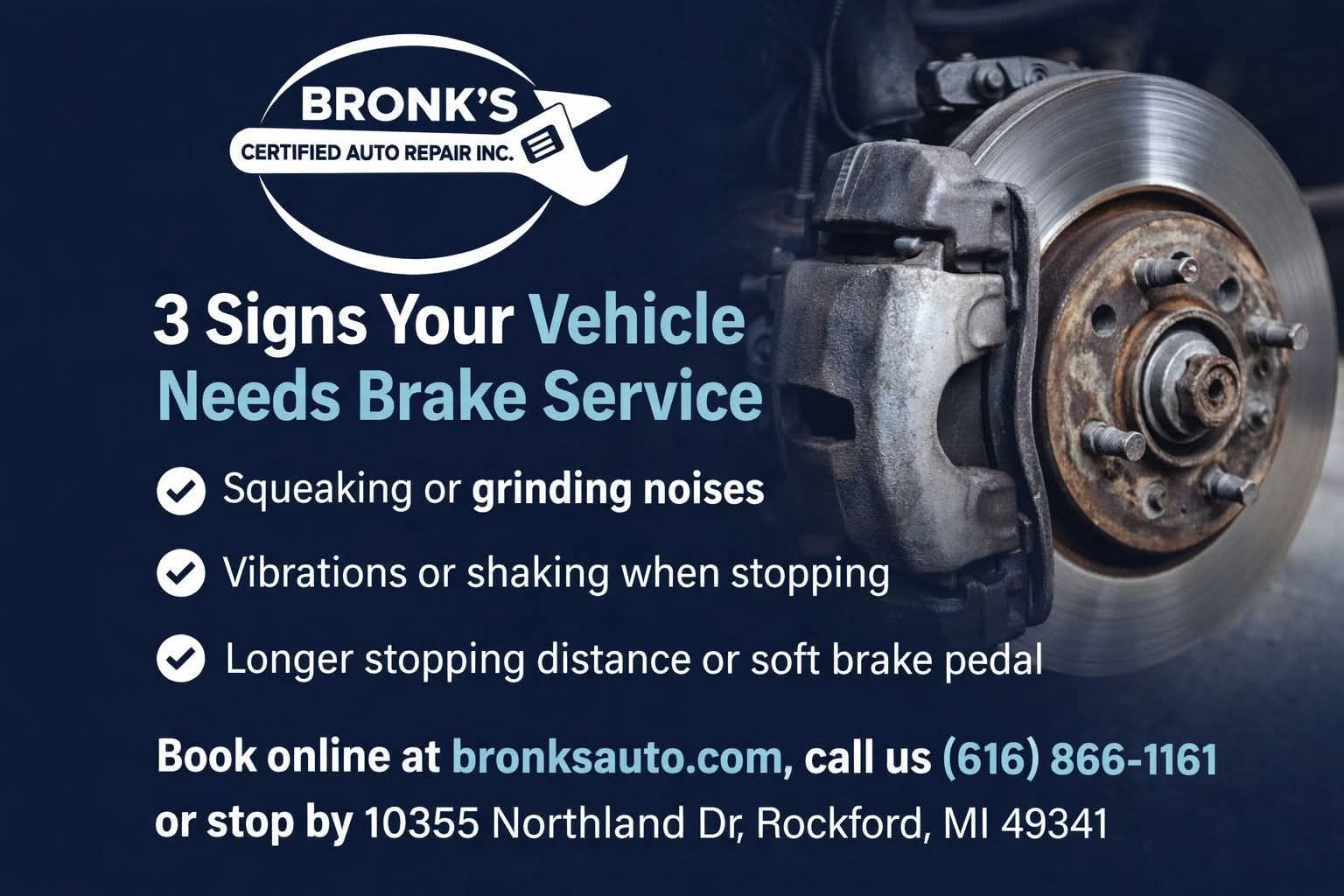 At Bronk’s Certified Auto Repair in Rockford, MI, we specialize in professional brake inspections, brake repair, and complete brake service for all makes and models. Below are three common signs your vehicle may need brake service—and why addressing them early matters.